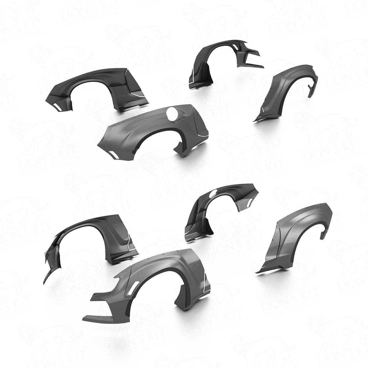 Included parts: front fender flares, rear fender flares, sickles for front & rear fender flares, front bumper splitter, side skirt splitters, rear bumper splitters, ducktail, roof shark vortex (look at photos);